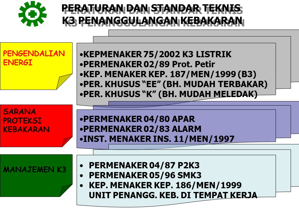 Sebagai acuan dasar hukum Keputusan Menteri Tenaga Kerja No. Kep-186/MEN/1999 tentang Penanggulangan Kebakaran di Tempat Kerja.
